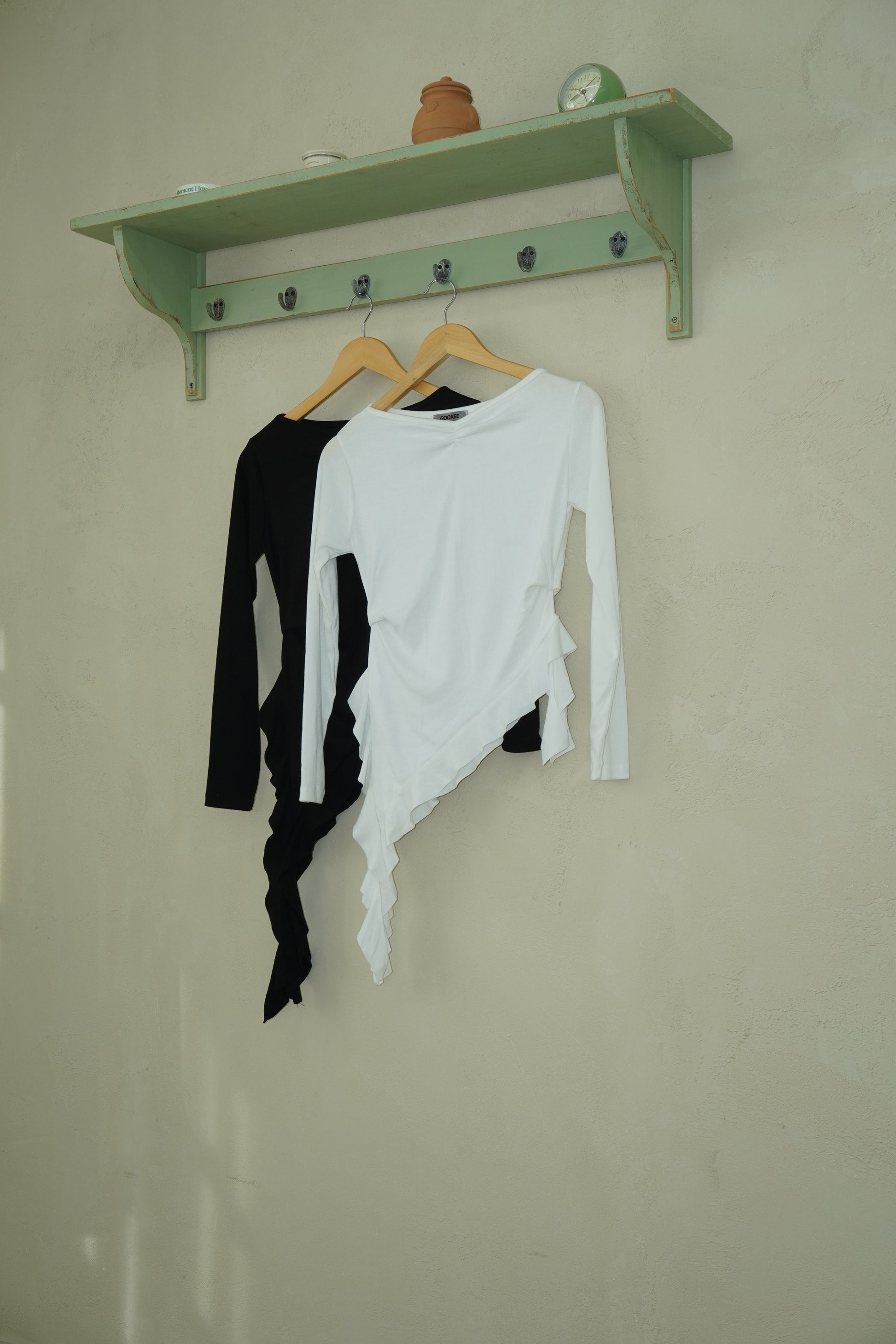 Elevate your everyday style with our textured ruffle knit. Designed with delicate ruching details, this cozy top adds a subtle feminine touch to any outfit. Perfect for layering or wearing on its own for a chic, effortless look.